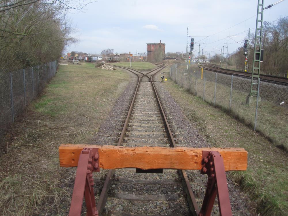 „This is the end“ – das Ende jedenfalls der Gleisanlage des Museums. Links im Bild erkennt man das ehemalige Einfahrtsgleis in den Bahnhof Wittenberge aus Richtung Magdeburg. Rechts sind die heutigen Gleise von und nach Stendal/Magdeburg zu sehen. Sie führen in einem großen Bogen um das Museumsgelände herum.