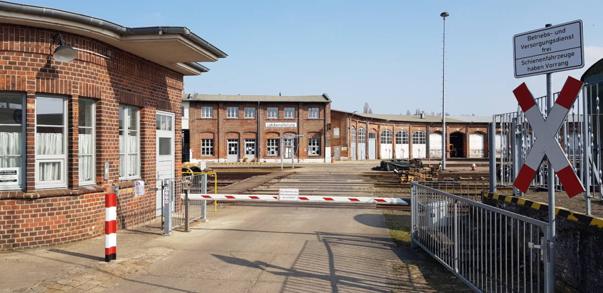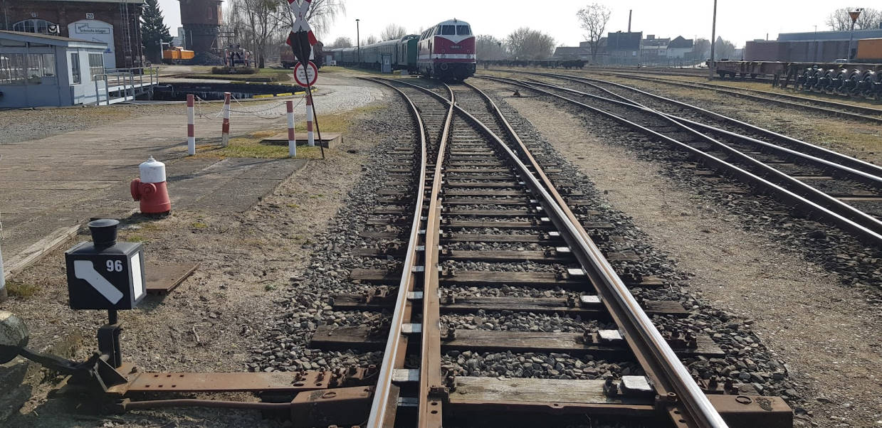 Blick auf die ehemalige Magdeburger Bahnhofsseite. Hier fuhren bis 1999 die Züge in und aus Richtung Süden. Heute finden hier unsere Führerstandsmitfahrten statt. Außerdem ist ein Gleisbaumaschine ausgestellt. Die Brachfläche daneben wird seit kurzem durch eine Straße und ein kleines Einkaufszentrum belebt.
