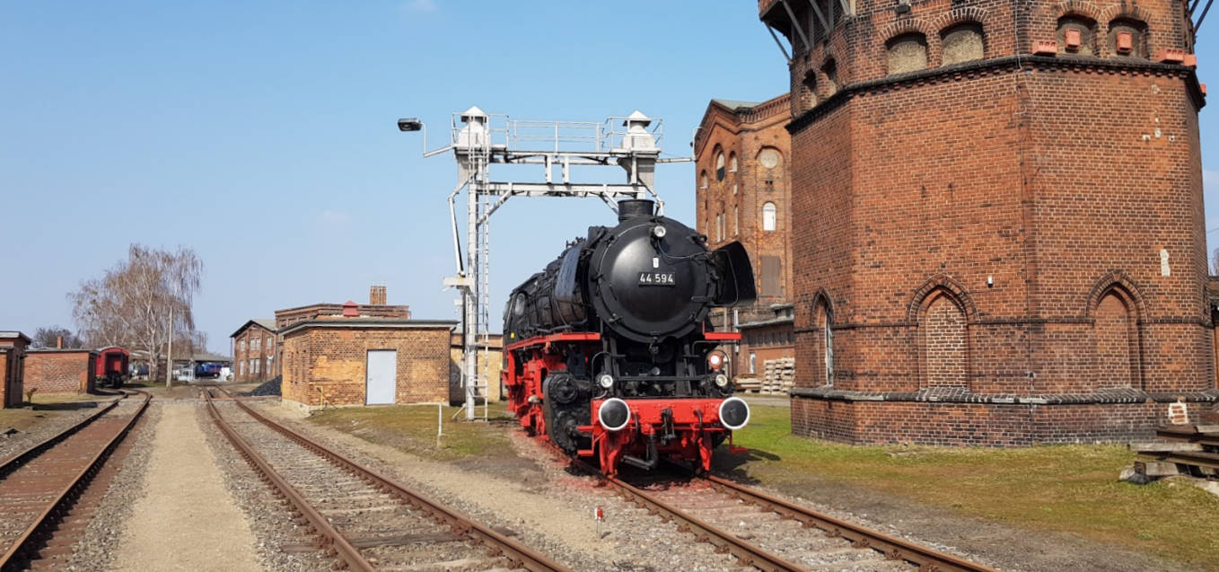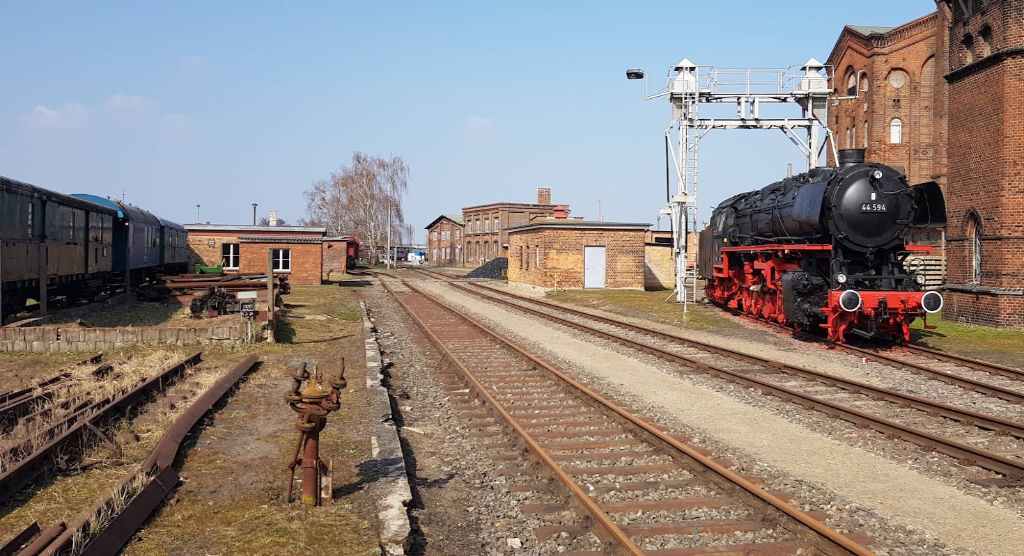 Blick zurück auf den Lokschuppen 2, der heute das Museum beherbergt. Rechts im Bild das ehemalige Wasserhaus, in dem sich ehemals große Wasserbehälter zur Versorgung der Dampflokomotiven befanden