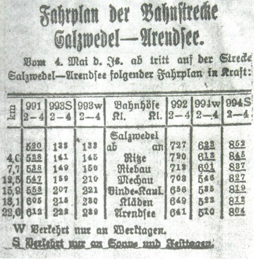 Immer wieder wird über die Streckenstilllegungen sowie eine Wiedereröffnung unter einem neuen Betreiber der Eisenbahnstrecke von Salzwedel über Arendsee nach Wittenberge diskutiert. Dieser Bericht möchte daran erinnern mit wie viel Anstrengungen und Hoffnungen unsere Väter vor nunmehr 85 Jahren diese Bahnverbindung als damalige Verbindung von der kleinen Altmark in die weite Welt begrüßten.