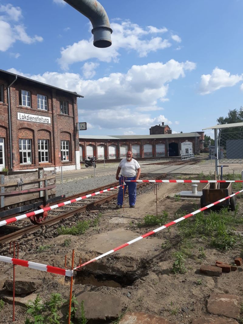 Die Sommersaison und die warmen Temperaturen laden zwar nur bedingt zu schweißtreibenden Aktivitäten im Historischen Lokschuppen ein. Dennoch sind die Aktiven nicht untätig und arbeiten an Fahrzeugen und Einrichtungen. So wurde erstens der Auffangtrichter am Wasserkran vor der Lokleitung abgebaut und ein neues Fundament samt Sickergrube errichtet. Demnächst wird der Trichter wieder aufgesetzt und dann hoffentlich die nächsten Jahre wieder stabil stehen.