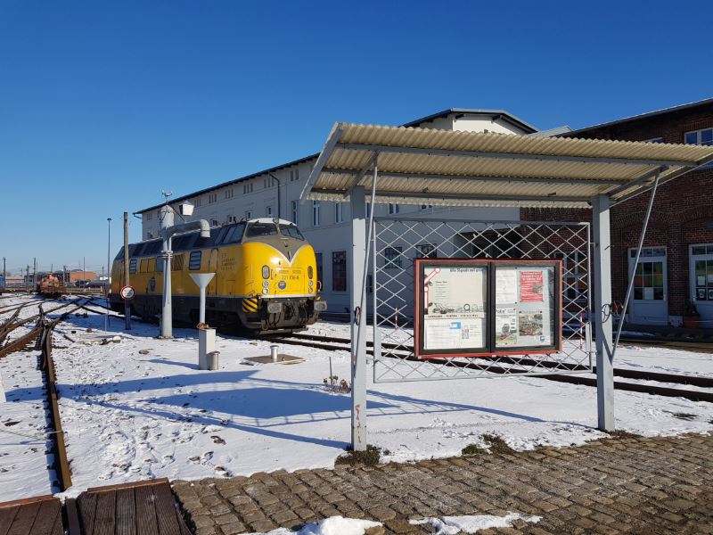 Vor der Lokleitung parkt die 221 106 der Eisenbahngesellschaft Potsdam. Die mächtige Diesellok wurde in den letzten Jahren hauptsächlich im Güterzugdienst in der Prignitz eingesetzt und wartet jetzt auf einen Werkstatttermin.