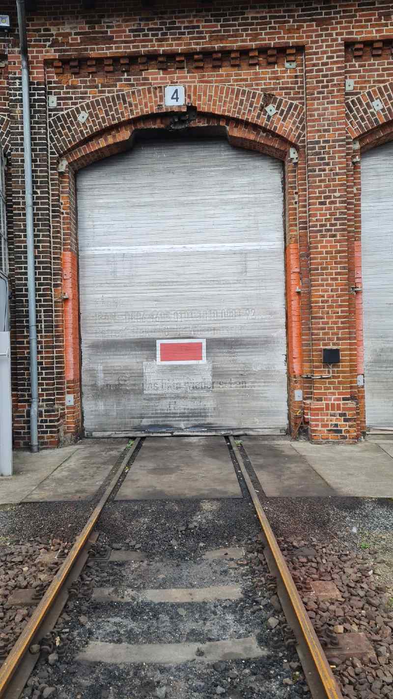 Bevor wir über die erfreulichen Ereignisse der beiden vergangenen Wochen sprechen, gibt es auch Ärgerliches zu berichten. So war vor einiger Zeit das Rolltor auf Gleis 4 aus seinen Führungsschienen entgleist. Dabei hatten sich die Lamellen des Rolltors entkoppelt und es ließ sich deshalb nicht mehr hochziehen. Sie fragen sich vielleicht, warum wir darüber berichten? Weil so eine Reparatur eben auch zum Museumsbetrieb gehört, jede Menge Arbeitskraft bindet und man nachher nichts sieht. So haben drei Leute einen Tag mit der Reparatur verbracht. Die gute Nachricht ist, dass es wieder zuverlässig funktioniert. Danke nochmal an die fleißigen Helfer. Das Bild zeigt das reparierte Tor. Es war beim Entgleisen an der hellen Lamelle im oberen Drittel auseinandergerissen. Diese musste nun getauscht werden.
