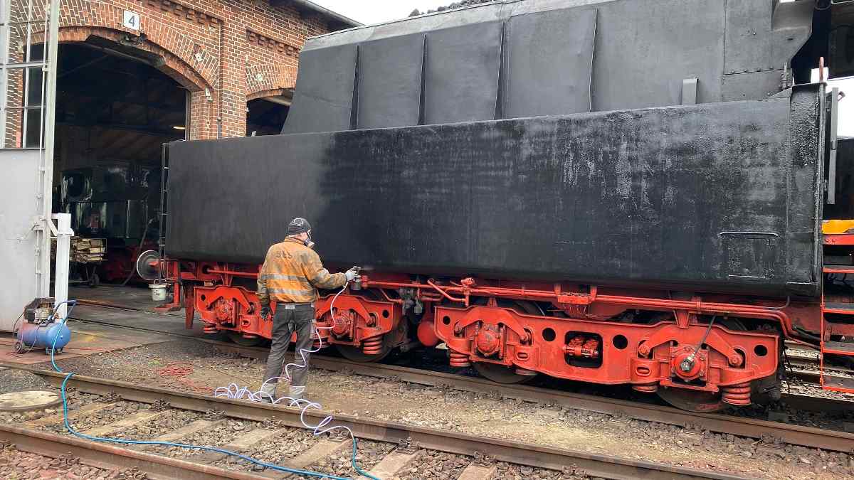 Zunächst wurde die Dampflok 50 3570 lackiert. Zum Glück war an den vergangenen Tagen das Wetter trocken und windstill, so dass die Farbe unter freiem Himmel aufgesprüht werden konnte.