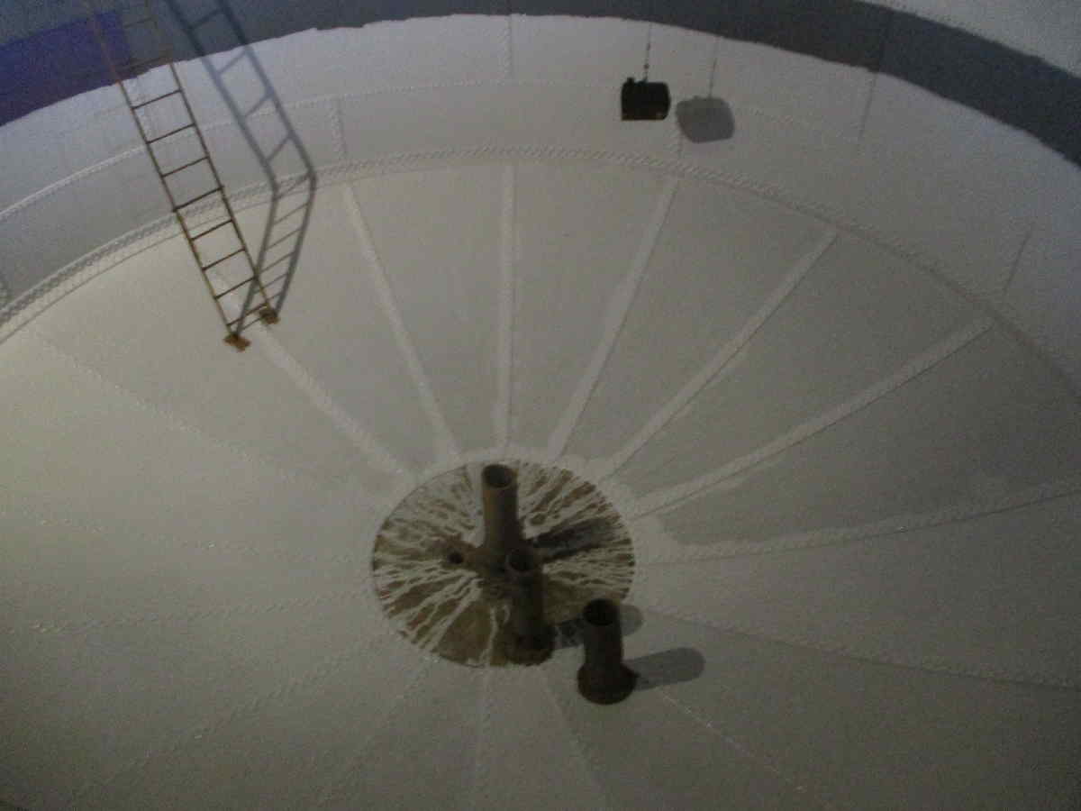 Bevor wir zu unserer Veranstaltung wieder Wasser in unseren Wasserturm pumpen können, musste Anstrich zum Korrosionsschutz vollendet werden. Das folgende Bild zeigt den Boden und Seitenwand des großen Wasserbehälters. In der Mitte erkennt man den Ablauf in die großen Versorgungsleitungen zu unseren Wasserkränen.