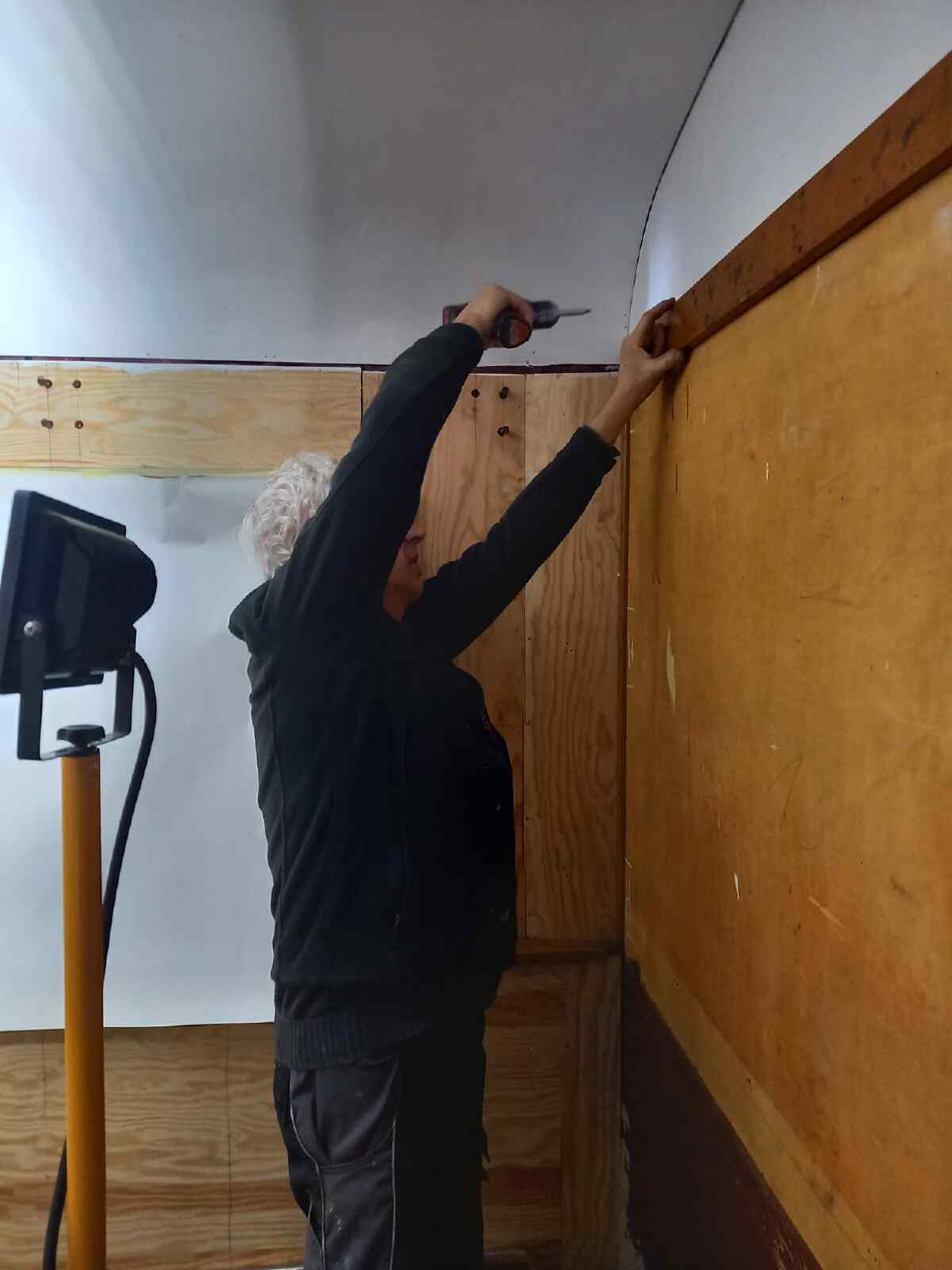 Wir arbeiteten auch weiter am Innenausbau des Wagens 197 805. Dessen Dach und Wände hatten im vergangenen Jahr eine neue Innenverkleidung erhalten, die jetzt weiß gestrichen wurde. Nachdem die Farbe getrocknet war, konnte mit der Montage der Holzleisten begonnen werden, welche die Lücken zwischen den Platten verdecken.
