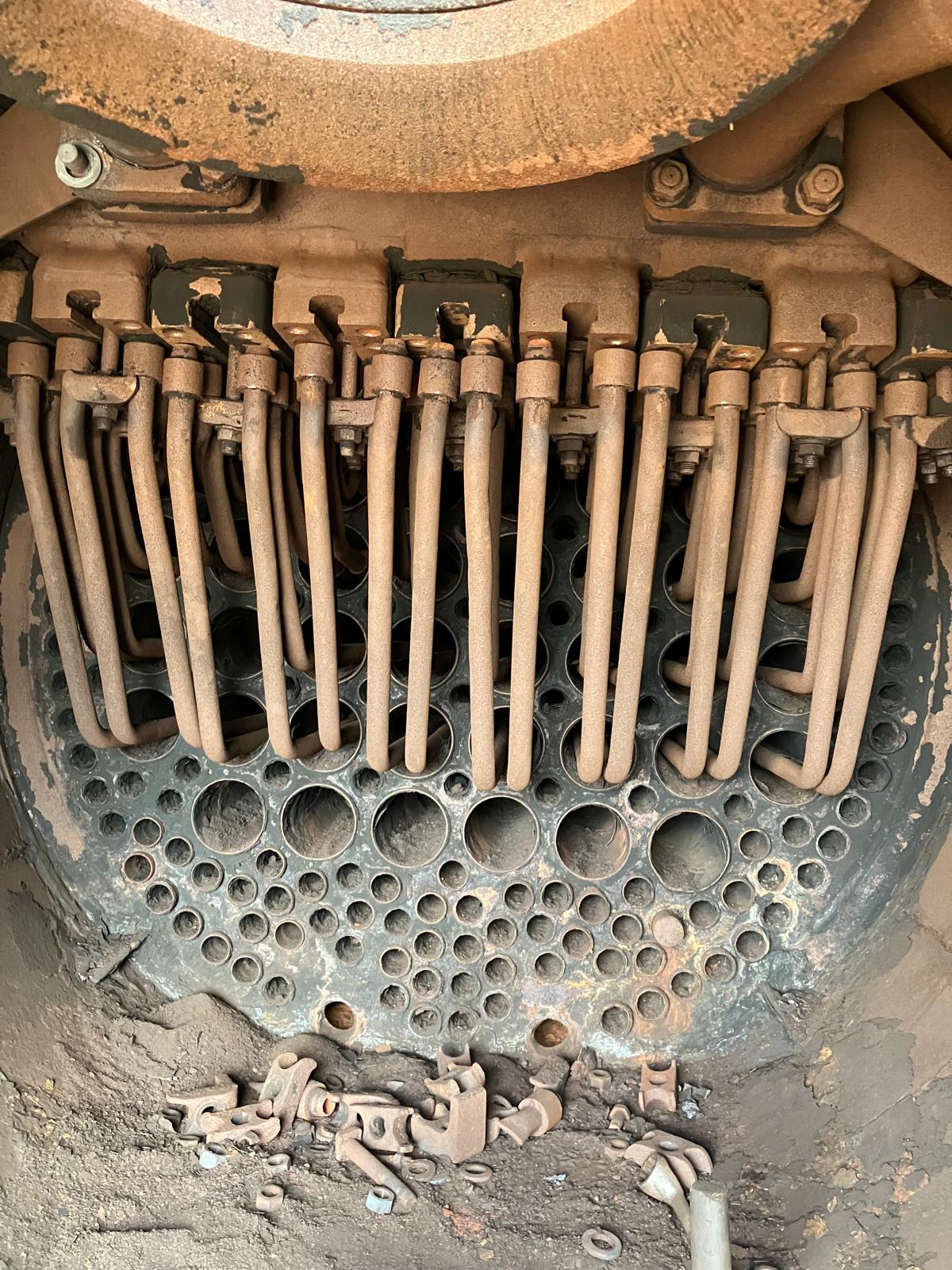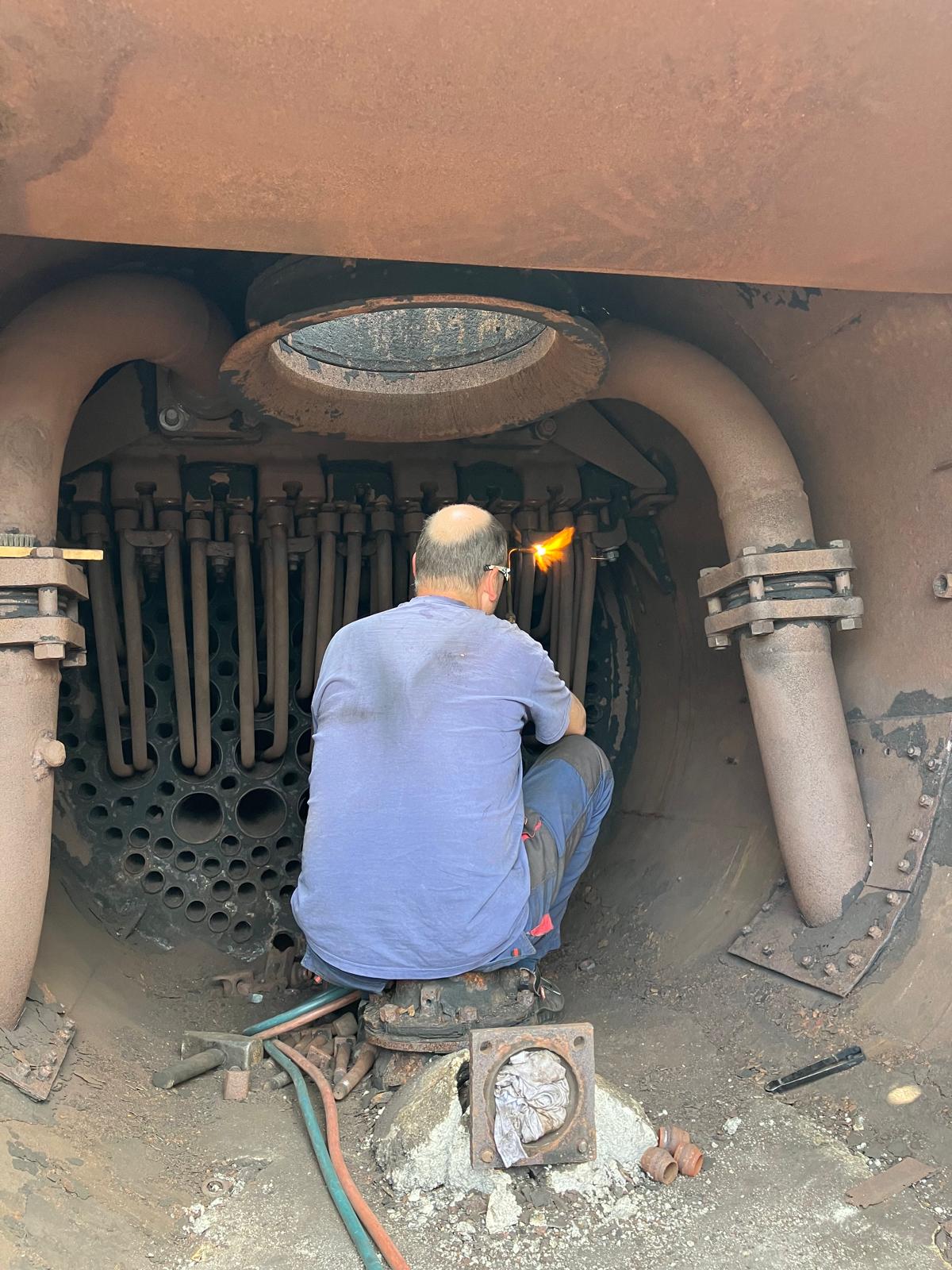 Zudem wurden die sogenannten Überhitzerelemente aus dem Kessel ausgebaut. Dabei handelt es sich um Rohrschlangen, in denen der frisch erzeugte Dampf noch einmal extra erhitzt wird, um den Wirkungsgrad der Dampfmaschine zu erhöhen. Der Ausbau ist in der Regel sehr anstrengend, denn die Befestigungen dieser Elemente sind meist so festgegangen, dass man sie nur mit Erhitzen und großem Kraftaufwand lösen kann. Am Ende freut man sich auf jeden Fall auf die Dusche (und ein kaltes Bier).