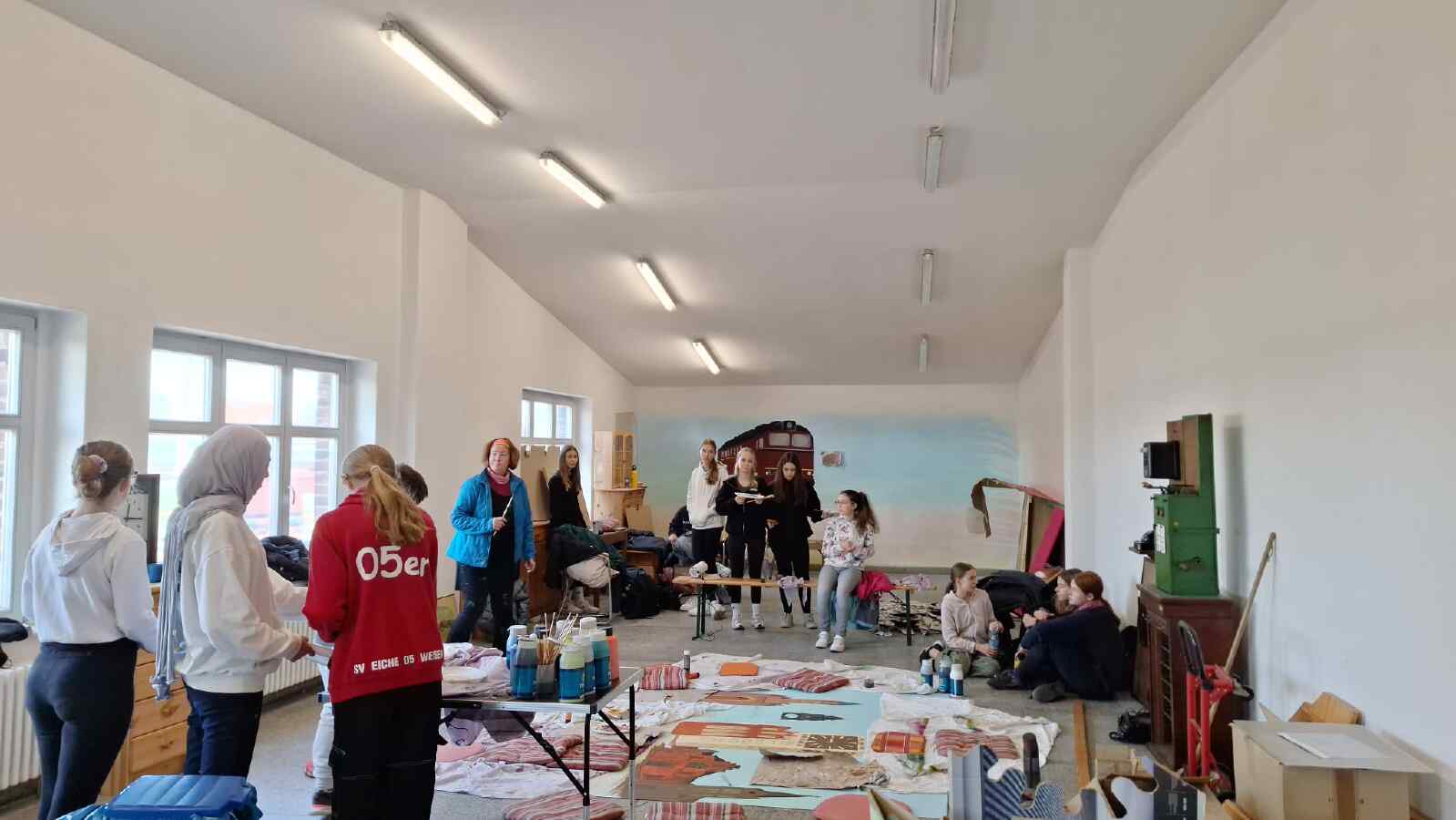 Doch auch nach der Veranstaltung geht es im Museum weiter: Ganz besonderes Vergnügen bereitet uns eine Schülergruppe des Marie-Curie-Gymnasiums, die im Rahmen eines Kunstprojektes einige Wände in unserem zukünftigen Ausstellungsraum gestaltet. Dabei werden Eisenbahnmotive aus Wittenberge nach Fotovorlage auf die Wände gemalt. Wir sind begeistert und sagen Danke, dass die Motive so toll geworden sind.