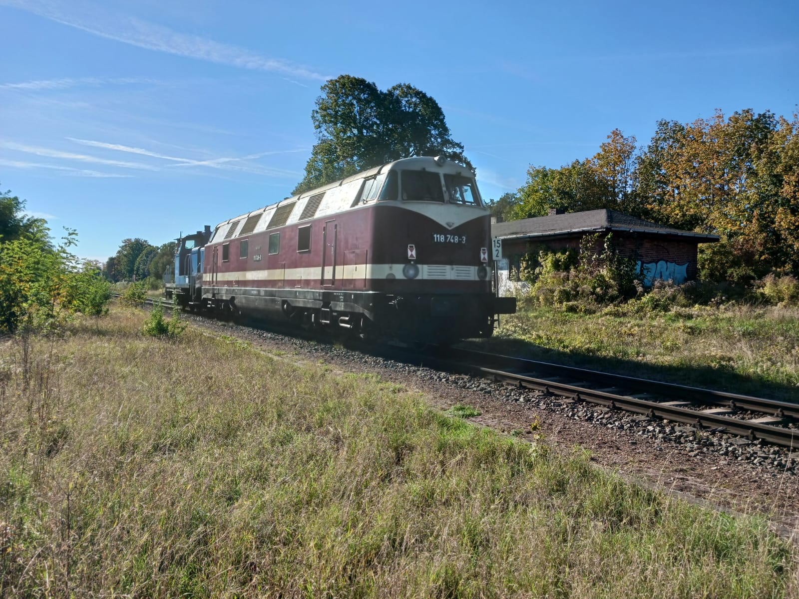 An dieser Stelle können wir dann auch noch ein Geheimnis lüften: Die bisher in unserem Museum als Ausstellungsstück bereitgehaltene Diesellok 118 754 wurde Anfang der Woche ins Mansfelder Land geschleppt. In einer Fachwerkstatt in Klostermannsfeld wird die Lok in den nächsten Monaten hauptuntersucht. Nach Abschluss dieser Arbeiten steht sie dann hoffentlich wieder für Fahrten in ganz Deutschland zur Verfügung. Wir freuen uns außerordentlich darüber und werden hier von Zeit zu Zeit über den Fortschritt der Arbeiten berichten. Die folgenden Bilder zeigen das Gespann vor der Abfahrt in Wittenberge und bei Förderstedt südlich von Magdeburg.
