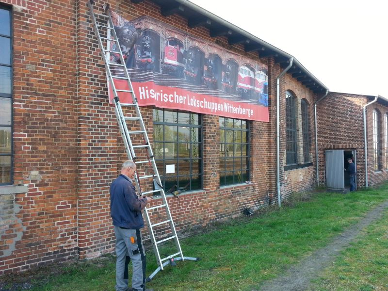 Ein bisschen Werbung in eigener Sache ist auch erlaubt: An der rückwärtigen Fassade des Lokschuppens wurde ein großes Banner angebracht, das vorbeifahrende Bahnreisende auf das Museum neugierig machen soll.