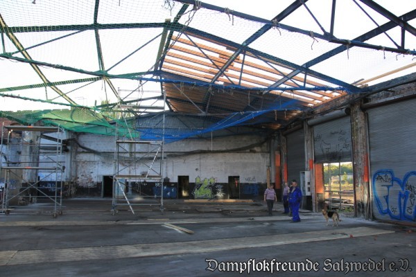Darüber hinaus wurden die Rolltore, soweit derzeit möglich, geöffnet, um den Baumaschinen Platz zum Manövrieren zu schaffen. Im Schuppen wurde die alte Waschanlage nebst Heizrohren abgebaut und es wurde damit begonnen, das baufällige Dach sowie einen Anbau im Bereich des ehemaligen Schuppens I abzutragen.
