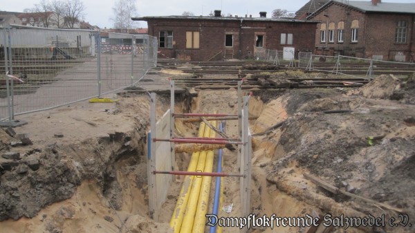 Inzwischen haben die Bauarbeiten im Bereich der Lokschuppen II und III des ehemaligen Bw Wittenberge begonnen:
