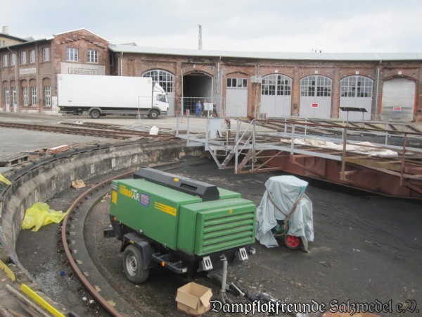 Weitere Fortschritte machen auch die Gleisanlagen außerhalb der Lokschuppenanlage. So wurden die Zufahrtsgleise zur Drehscheibe wiederhergestellt. Derzeit werden die Gleise zur und an den Untersuchungsgruben neu verlegt und gestopft.