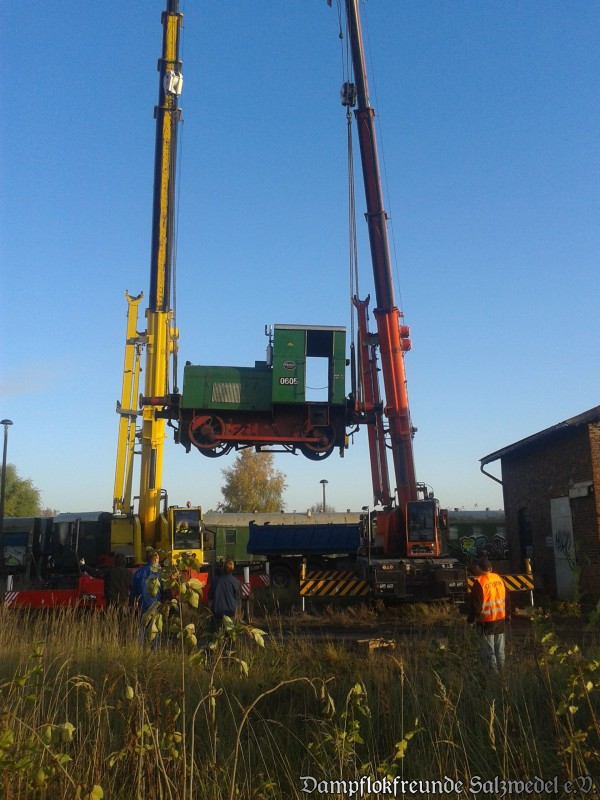 Aber die Geschichte geht weiter: Am 3.11.2012 wurden Kleinloks und Rangiergeräte per Tieflader nach Wittenberge gebracht. Der Konvoi bestehend aus fünf Tiefladern und zwei Autokränen sorgte auf der gesamten Strecke für erstaunte Gesichter.