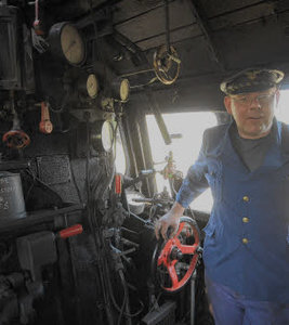 Heizer Gernot Gattermann schippt in der großen Dampflok vor der nächsten Fahrt Kohlen nach. |