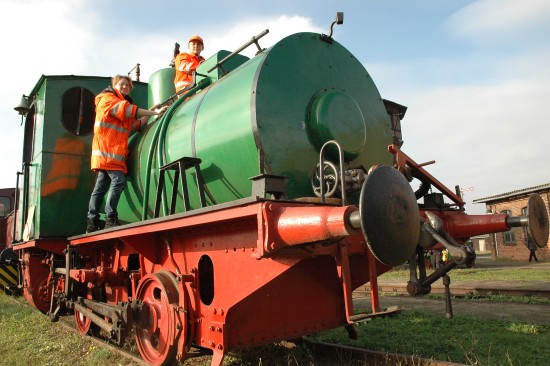 Andere putzen im Frühjahr, Familie Förster putzt im Herbst. Das liegt vornehmlich daran, dass Conny, Bernd und Sohn Robert stolze Besitzer von diversen Lokomotiven sind. Unter anderem gehört ihnen die ehemalige Werkslok des Kraftwerkes Herrenwyk, die am ehemaligen Bahnbetriebswerk Salzwedel geparkt ist. Und weil am Wochenende die Saison der Dampflokfreunde ausklang, brachten sie ihre liebevoll "Lotte" genannte Eisenbahn auf Vordermann für den Winterschlaf. Mit orangefarbenen Reflektorjacken bildete die Familie einen hervorragenden Kontrast zu ihrer grasgrünen Lok.