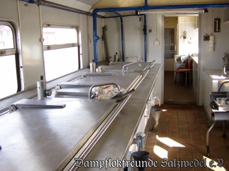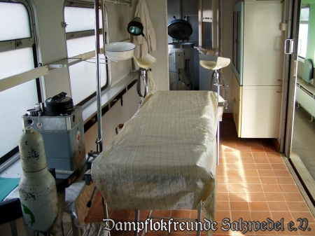 Unser Zug, von dem wir Ihnen den OP-, Küchen- und Maschinenwagen präsentieren können, war Zeit seines kurzen Einsatzlebens in Jerichow stationiert und fand sich Anfang der neunziger Jahre in Salzwedel zum Verschrotten ein, wovor wir jedoch die drei wichtigsten Wagen bewahren konnten. Doch machen wir einen kleinen Rundgang durch die Fahrzeuge: