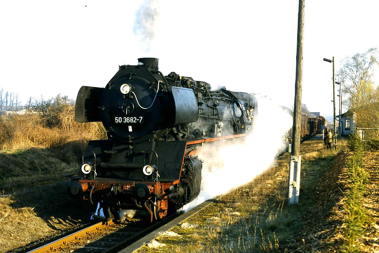 Zu den genannten 208 Exemplaren gehört auch unsere 50 3682, die 1939 bei Krauss-Maffei in München gebaut und von der Deutschen Reichsbahn als 50 255 in Betrieb genommen wurde. Sie hatte ein bewegtes Leben. So wurde sie von 1948 bis 1952 im sogenannten Kolonnendienst eingesetzt. Dabei wurden Maschinen und Güter aller Art, die von der Sowjetunion als Reparationsleistungen nach dem Krieg beansprucht wurden, bis an die polnisch/russische Grenze gefahren, wo sie in Güterzüge mit russischer Breitspur umgeladen wurden. Solche Fuhren dauerten mitunter Wochen.