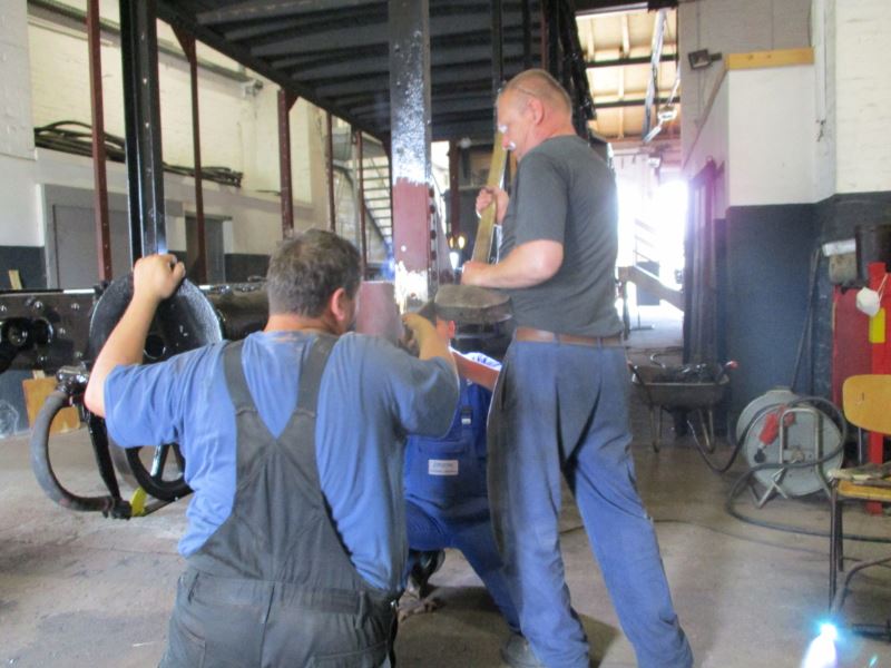Einige der in Wittenberge verbliebenen Aktiven beschäftigten sich mit der weiteren Restaurierung unseres Güterwagens G10 aus dem ersten Viertel des vergangenen Jahrhunderts. Dessen metallene Rahmenteile und Streben sind noch genietet. Da sich während der letzten Restaurierungsschritte gezeigt hatte, dass einige Nietverbindungen aufgrund von Rost schwach geworden waren, mussten sie ersetzt werden. Die folgenden Fotos zeigen die Arbeiten beim Einsetzen neuer Nieten: