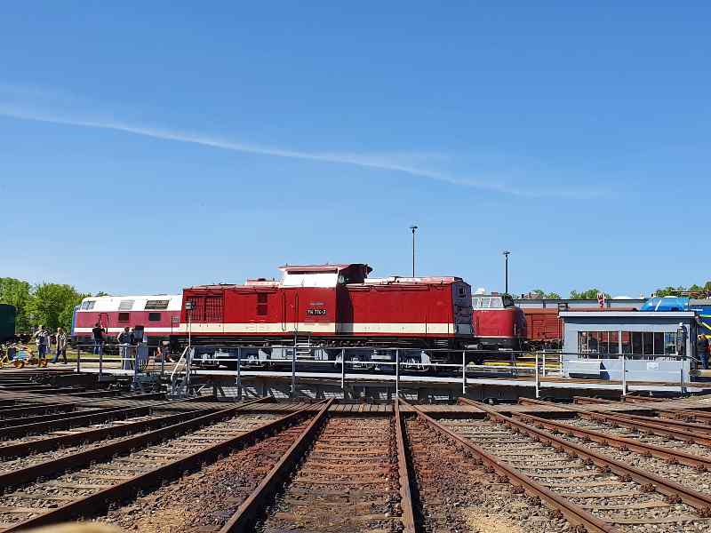 Außerdem steuerte die Eisenbahngesellschaft Potsdam noch einige Exponate für die Lokausstellung im Außengelände bei. Vielen Dank nochmal dafür! Im folgenden Bild erkennt man in dunkelroter Lackierung die Diesellok 221 145 der ehemaligen Deutschen Bundesbahn neben ihrer Schwester 118 692 der Deutschen Reichsbahn.