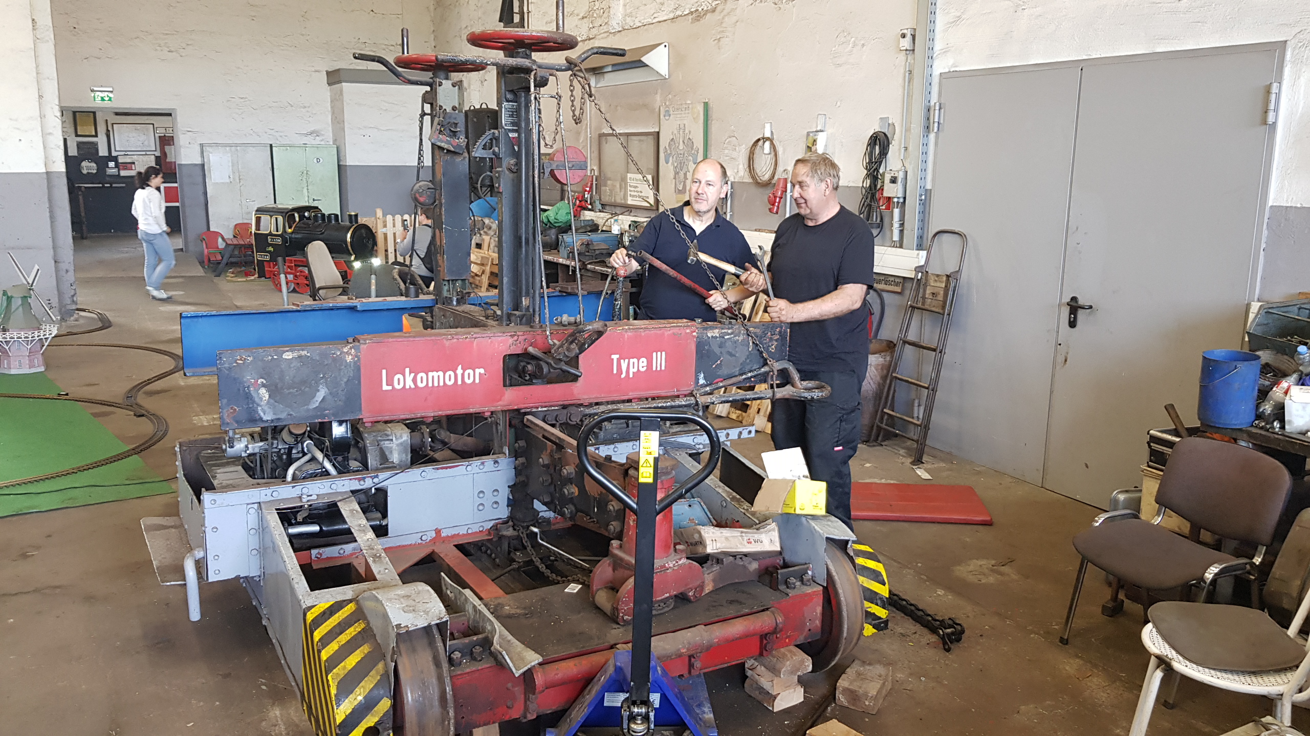 Leider brannte das Museum Mitte der 1990er Jahre nach einer Brandstiftung bis auf die Grundmauern ab, was auch den Rangiertraktor in Mitleidenschaft zog. Da es dort keine Zukunft mehr für ihn gab, übergab uns sein Eigentümer das Fahrzeug als Dauerleihgabe im Jahr 2002. Wir haben uns vor einiger Zeit dazu entschlossen, das Fahrzeug wieder betriebsfähig aufzuarbeiten und damit an den Werksgüterverkehr zu erinnern, den es auch in Wittenberge in größerem Umfang gab (z.B. Nähmaschinenwerk, Ölmühle, Gasanstalt). Was bedeutete es, das Fahrzeug „aufzuarbeiten“? Wir hatten zunächst das Dach und den Führerstand abgenommen. Nach Begutachtung des Innenlebens entschieden wir uns dazu, den Motor, Anlasser, Lichtmaschine, das Getriebe, die Kupplung, Antriebswelle, die Bremsanlage und die Achsen und Antriebsketten auszubauen. Die Teile wurden ihrerseits komplett zerlegt, gereinigt und teilweise unter Verwendung neuer oder neu angefertigter Teile wieder zusammengesetzt.
