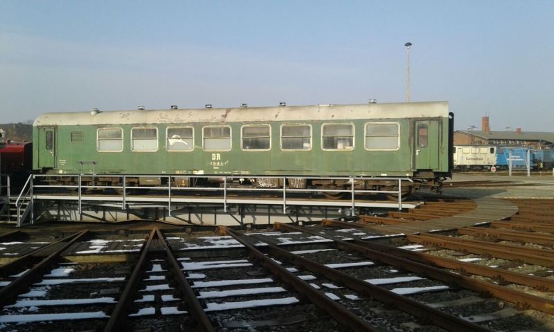 Katastrophenzug, den wir bereits in unserem Bestand haben. Der Wagen mit der Nummer 67 50 99-48 164-9 wurde 1986 im Ausbesserungswerk Halberstadt aus einem Reisezugwagen der Gattung Bghw umgebaut. Er diente als Unterkunft für das Begleitpersonal der Deutschen Reichsbahn für den K-Zug, der wie an anderer Stelle schon berichtet, verletzte russische Soldaten gen Heimat beförderte. Der Wagen war dem Bahnbetriebswerk Seddin zuordnet. Er befand sich bis 1993 im Bestand der Deutschen Reichsbahn und wurde dann an die Magdeburger Eisenbahnfreunde e.V. verkauft, die ihn im Magdeburger Hafen abstellten.