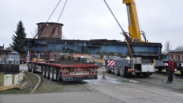 Zusammengesetzt wird die Brücke 20 Meter lang sein. Die Teilstücke sind jeweils elf und dreizehn Tonnen schwer. Hinzu kommt ein etwa zweieinhalb Tonnen schweres Teil des Drehpunktes. Die Brückenteile wurden mit einem Kran auf Schienenwagen verladen, damit sie auf dem Gelände mobil sind und nicht starr rumliegen. „Wir können sie dann in die Schuppen bringen und wetterunabhängig an ihnen arbeiten. Auch wenn sie grundsätzlich in einem sehr guten Zustand sind, bedarf es natürlich einer Aufarbeitung der Teile. Vieles muss zumindest neu lackiert werden“, bemerkt Dennis Kathke zu den anstehenden Arbeiten. Mit dem Erwerb der ausrangierten Anlage werden auch die Pläne zur Erweiterung des Areals konkreter. Ihren Platz wird die zweite Drehscheibe nach der Restaurierung vor dem alten Lokschuppen I finden, denn wenn dieser teilweise wieder aufgebaut ist, braucht man die Scheibe, um die Loks überhaupt hineinzubringen. Im Moment fehlt es an Unterstellmöglichkeiten.