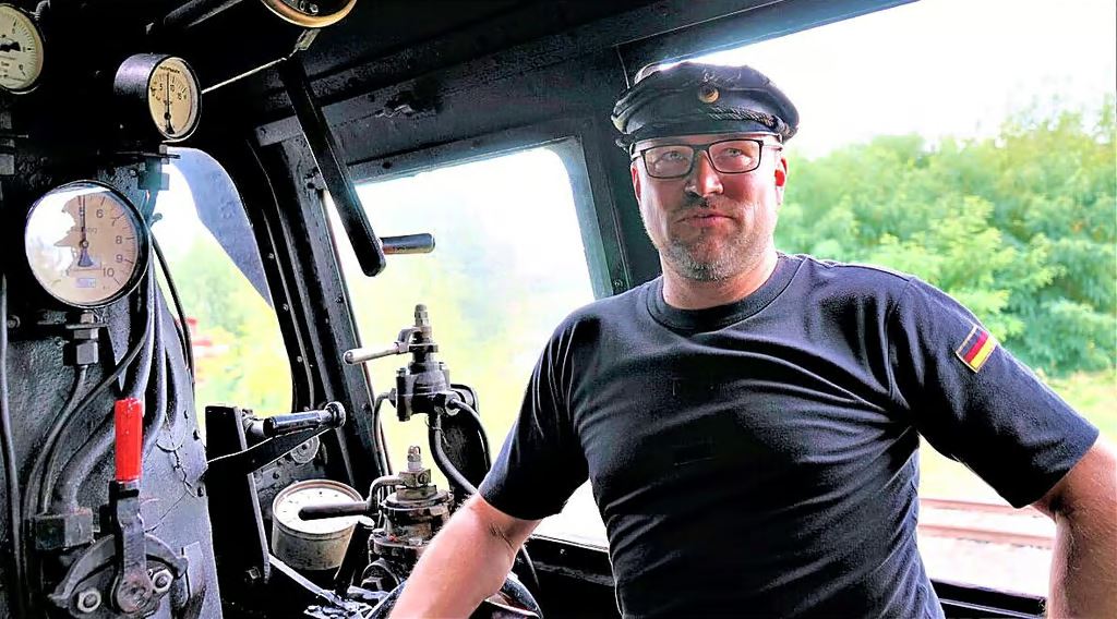 Dennis Kathke ist 2. Vorsitzender der Eisenbahnfreunde und nimmt Besucher im Führerstand einer Dampflok mit. Foto: Alexander Rekow |